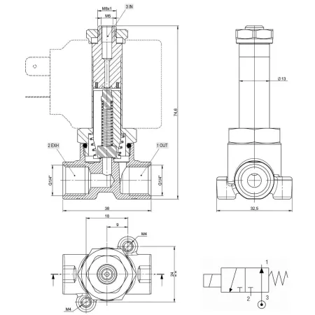3/2 распределитель прямого действия с электромагнитным управлением.