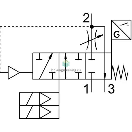 3/2 распределитель с электромагнитным управлением и пилотным каскадом.