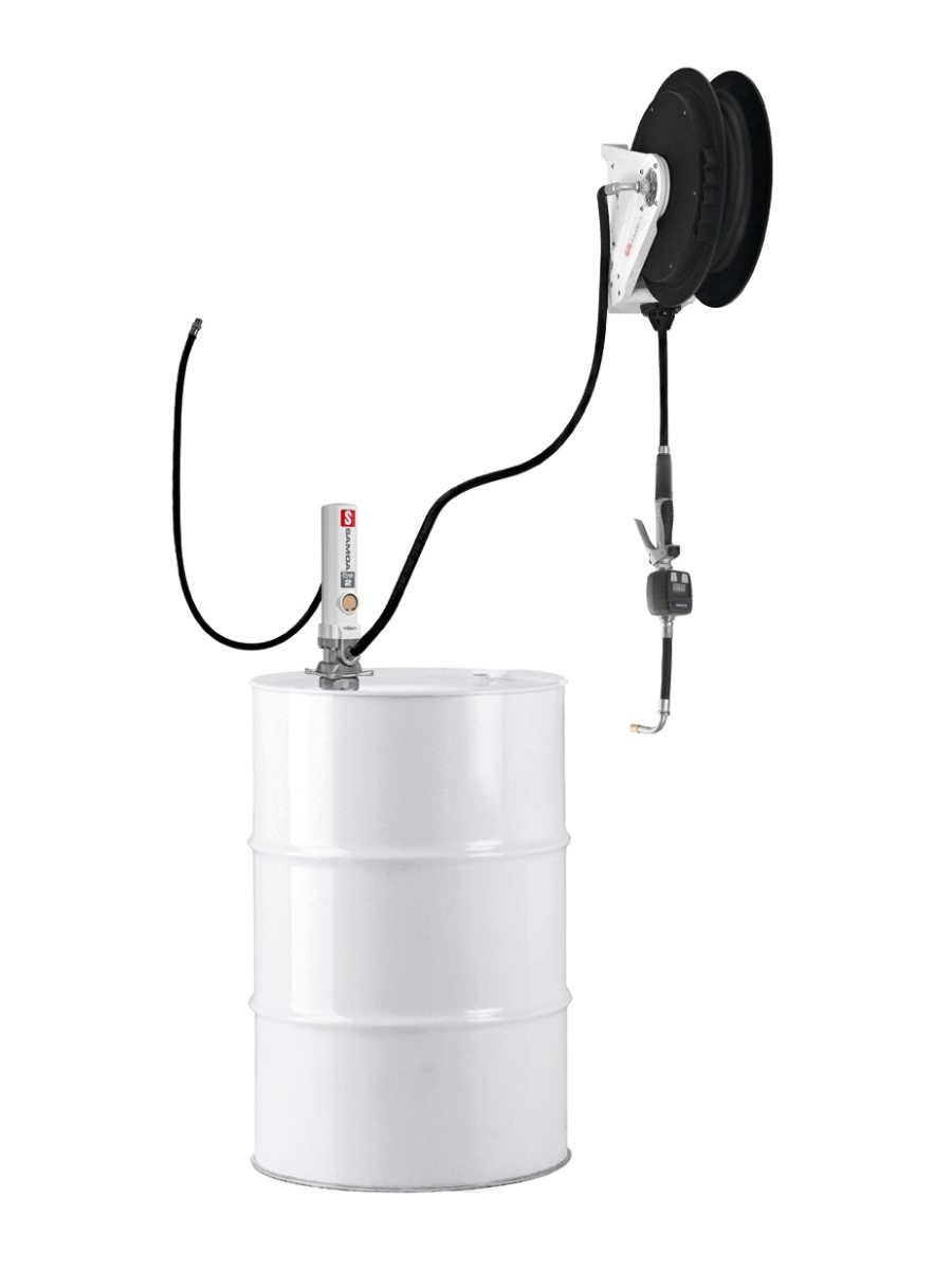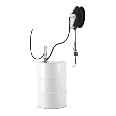 Комплект с насосом для масла 3:1 с катушкой и электронным счетчиком, монтаж на бочку. Полный комплект для бочек 205 л. Включает все аксессуары для установки и подключения источника сжатого воздуха.