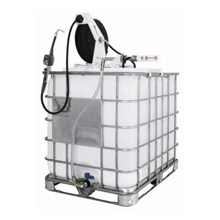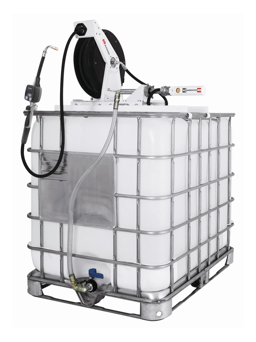 Комплект с насосом для масла 3:1 с катушкой для контейнеров 1000 л, монтаж сверху. В комплект входит всасывающий шланг для нижнего выходного отверстия контейнера.