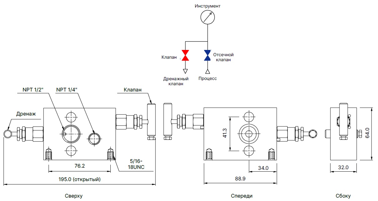 M2VDMTV8N-P-SOG Hy-Lok - Манифольд фланцевый, двухвентильный, NPT1/2, для кислых сред, 414 бар