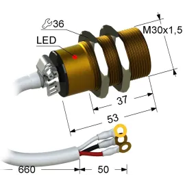 Дискретный выходНО, сухой контакт Тип установкивыступающий Номинальная дистанция переключения15 Электрическое подключениекабель Длина кабеля3 Крепежная резьбаM30x1.5 Корпуслатунь