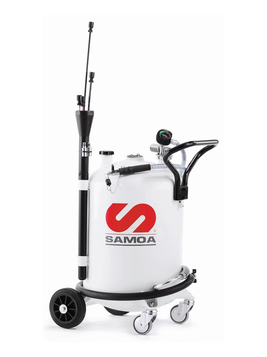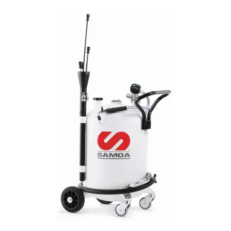 Мобильная установка для откачки отработанного масла. Масло всасывается пневматическим вакуумным насосом без движения и износа каких-либо деталей с помощью заборного щупа или переходника, вставленного в масляный щуп двигателя. После создания вакуума в баке установку можно использовать автономно, отсоединив от источника воздуха. Опорожнение выполняется через выпускной шланг путем создания давления с помощью насоса в емкость объемом 70 л. В комплект поставки этих установок входит предохранительный клапан, защищающий от сверхдавления.