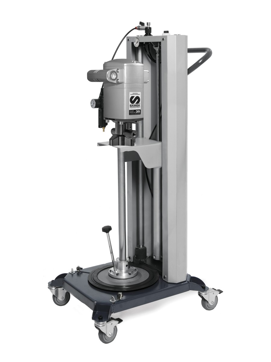 Нижняя часть насоса закреплен на индукторной пластине , насос установлен на пневматический поршень, который поднимает насос для замены пустого ведра.