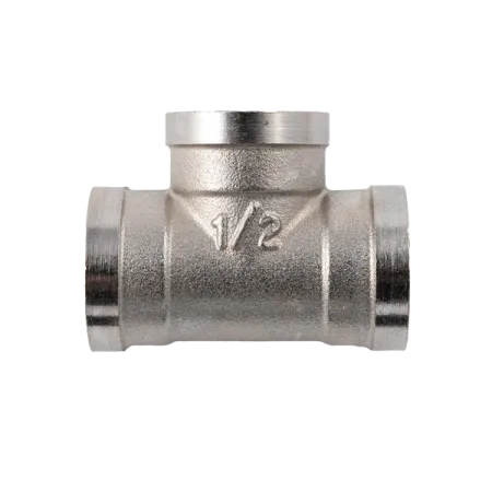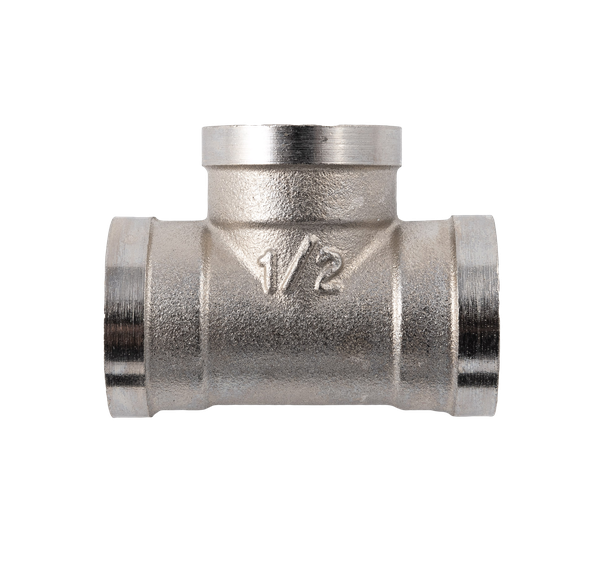 Форма фитинга: тройник T-образный с внутр. резьбой осевой • Подключение: G1/2 • Материал корпуса: латунь никелированная