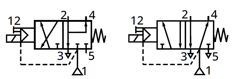 - один и тот же золотниковый клапан может быть адаптирован для 3/2 НЗ, или 5/2 функций управления невматическими приводами двухстороннего или одностороннего действия