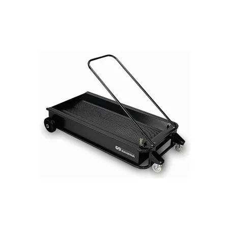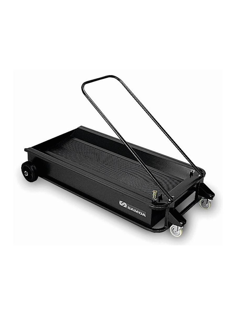 Низкопрофильная подкатная ванна предназначена для опорожнения самотеком через спускной кран или с помощью комплекта с насосом для откачки (номер детали 559100) через сухоразъемный гидравлический соединитель (номер детали 950 352) (не входит в комплект поставки). Ванна объемом 95 л (25 галлона США) для пассажирских автомобилей и небольших фургонов.
