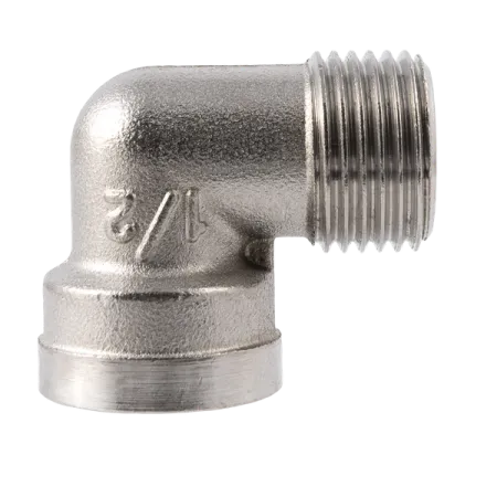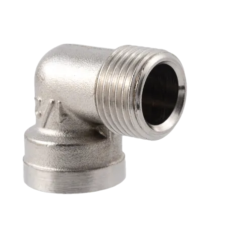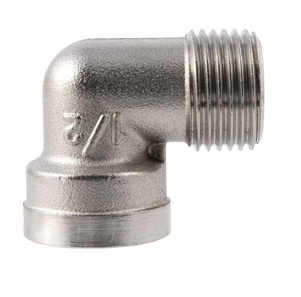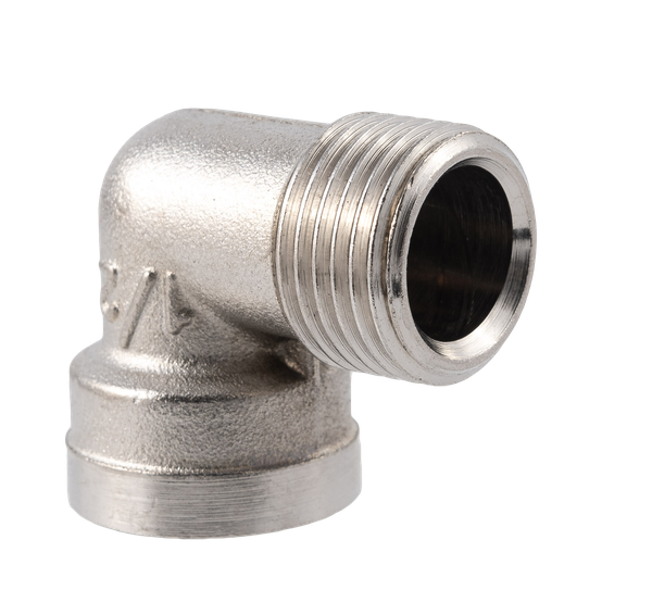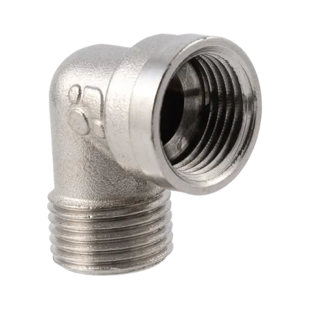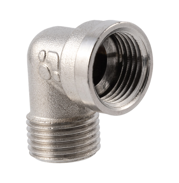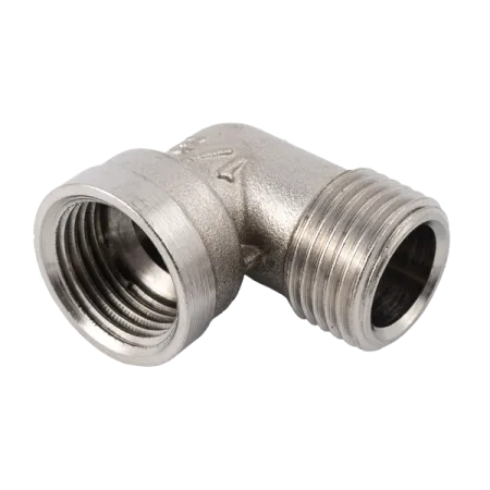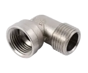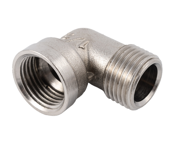 Форма фитинга: соединитель угловой с внутр.-нар. резьбой • Подключение: G1/2 • Материал корпуса: латунь никелированная