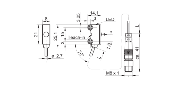 Дискретный выход: PNP/NPN • Диапазон измерения: 6000 мм • Электрическое подключение: разъём M8x1 4-пин, кабель • Длина кабеля: 0.2м • Класс защиты: IP67 • Рабочее напряжение: 12 ÷ 24 V DC • Материал корпуса: пластик