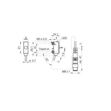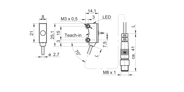 Дискретный выход: PNP/NPN • Диапазон измерения: 6000 мм • Электрическое подключение: разъём M8x1 4-пин, кабель • Длина кабеля: 0.2м • Класс защиты: IP67 • Рабочее напряжение: 12 ÷ 24 V DC • Материал корпуса: пластик