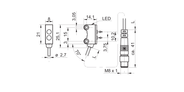 Дискретный выход: PNP • Диапазон измерения: 50 мм • Исполнение: с подавлением заднего фона • Электрическое подключение: разъём M8x1 4-пин, кабель • Длина кабеля: 0.2м • Класс защиты: IP67 • Рабочее напряжение: 12 ÷ 24 V DC • Материал корпуса: пластик