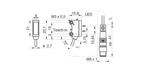 Дискретный выход: PNP • Диапазон измерения: 180 мм • Электрическое подключение: разъём M8x1 4-пин, кабель • Длина кабеля: 0.2м • Класс защиты: IP67 • Рабочее напряжение: 12 ÷ 24 V DC • Материал корпуса: пластик
