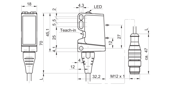 Дискретный выход: PNP/NPN • Диапазон измерения: 600 мм • Электрическое подключение: разъём M12x1, кабель • Длина кабеля: 0.2м • Класс защиты: IP67 • Рабочее напряжение: 12 ÷ 24 V DC • Материал корпуса: пластик