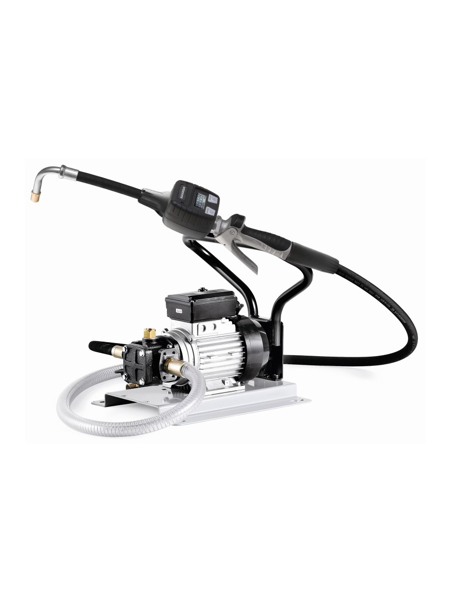 Переносной комплект с электронасосом серии Flowstar 230 В для масла с ручкой для переноски и всасывающим шлангом для бочек 205 л и контейнеров 1000 л, подающим шлангом и раздаточным пистолетом со счетчиком.