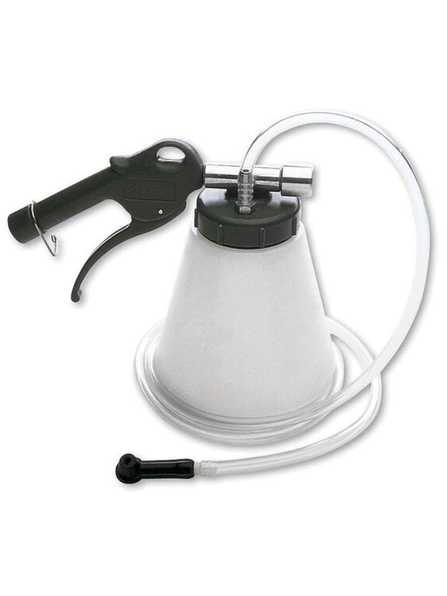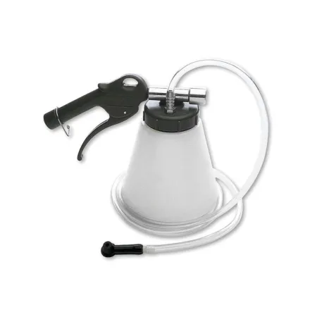 После присоединения прокачного ниппеля к пистолету для отсоса, вакуум, созданный сжатием воздуха, отсасывает тормозную жидкость через прозрачный шланг в емкость объемом 0,75 л.