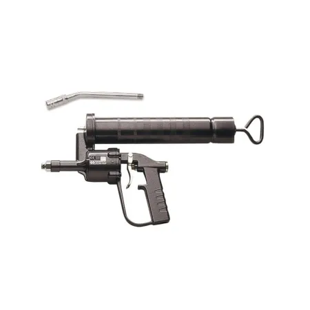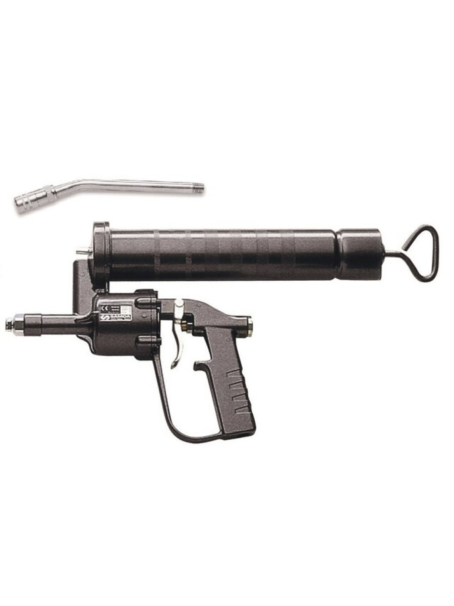 Шприц пневматический для смазки объемом 500 куб. см. Включает в себя корпус объемом 500 куб. см с пружинным смазочным механизмом и жесткой прямой трубкой с четырехлепестковым соединителем (PN 710 214). Трехсторонняя загрузка: 400 г (14 унций) картриджей со смазкой, всасывание смазки или с помощью заливочного насоса. Поставляется с заливным ниппелем и 400-миллиметровым армированным выходным шлангом с двойной стальной оплеткой, четырехлепестковым соединителем (PN 140 040) с заливным ниппелем. Коэффициент сжатия 60:1. Предназначены для подключения к магистрали сжатого воздуха или к пневматическому тормозному контуру грузового автомобиля. Подача: 1 куб. см при каждом нажатии на курок. Максимальное давление воздуха: 10 бар. Резьба для подключения воздуха 1/4» BSP (F)