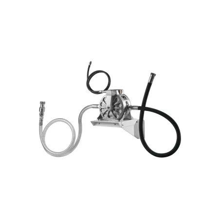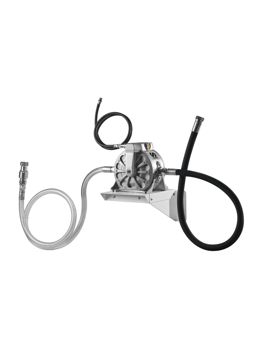 Комплект с двухмембранным насосом DF100 для опорожнения ванн для отработанного масла через сухоразъемный гидравлический соединитель. В комплект входит настенный кронштейн, воздушный соединительный шланг с быстросъёмной муфтой и соединителем, Шланг для слива масла 1,5 м и всасывающий шланг 1,5 м с сухоразъемным гидравлическим соединителем для соединителя 950 352.