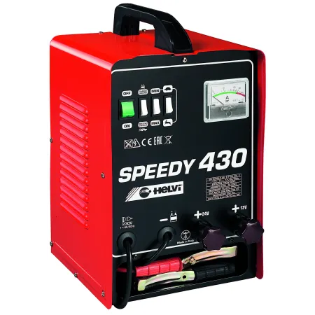 Профессиональное пуско-зарядное устройство HELVI Speedy 430 для аварийного запуска двигателя, когда пускового тока штатного аккумулятора не достаточно, а так же для зарядки аккумуляторов. Предназначено для автомастерских, автопарков предприятий, ведомств, для сервисной поддержки строительной и сельскохозяйственной техники, для частного (некоммерческого) использования. Принцип действия устройства заключается в преобразовании напряжения сети 220 В в выходное напряжение 12 V и 24 V, которое подается через медные кабели с зажимами-прищепками на клеммы аккумулятора. Скомпоновано пуско-зарядное устройство в металлическом корпусе (245х250х435) с удобной пластиковой ручкой для переноски (вес 18 кг). На лицевой части корпуса находится панель управления с функциональным и интуитивно понятным интерфейсом, на котором размещены: омметр, клавиша «пуск/стоп», переключатели тока зарядки (max 28 А) и тока запуска (max 350 А), контакты для подключения зарядного кабеля. Прибор имеет режим Boost (быстрая зарядка аккумулятора).