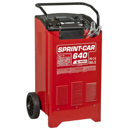Профессиональное пуско-зарядное устройство Helvi Sprintcar 640 для запуска силовых агрегатов при отказе штатного аккумулятора и зарядки аккумуляторных батарей различной емкости. Аппарат предназначен для эксплуатации в СТО, мастерских, автопарках и т. п. Питание прибора от сети 220 В. Мощность тока запуска до 550 А, максимальный ток зарядки – 50 А, максимальное напряжение на выходе – 12 V и 24 V. Устройство оборудовано надежной защитой от короткого замыкания и переполюсовки, системой стабилизации напряжения питания. Модель укомплектована медными кабелями и мощными щипцовыми зажимами клемм аккумулятора. Металлический корпус пуско-зарядного устройства достаточно компактен (320х487х745) для агрегата со столь внушительными техническими характеристиками. Вес - 30 кг. Решетка-воздухозаборник обеспечивает хорошее охлаждение трансформатора. Оснащенное большими колесами, ручкой для захвата и перемещения, двумя ножками-упорами, пуско-зарядное устройство можно с легкостью перемещать и моментально устанавливать в рабочее