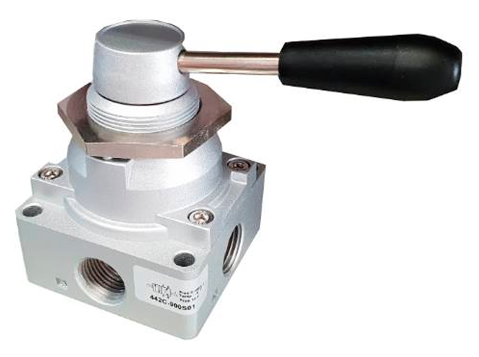 Пневматические распределители 4/2 и 4/3 лин.поз с ручным управлением. Могут быть закреплены на плоской поверхности при помощи 4-х винтов или закреплены панельно, используя фиксирующую гайку на корпусе (поставляется в комплекте).