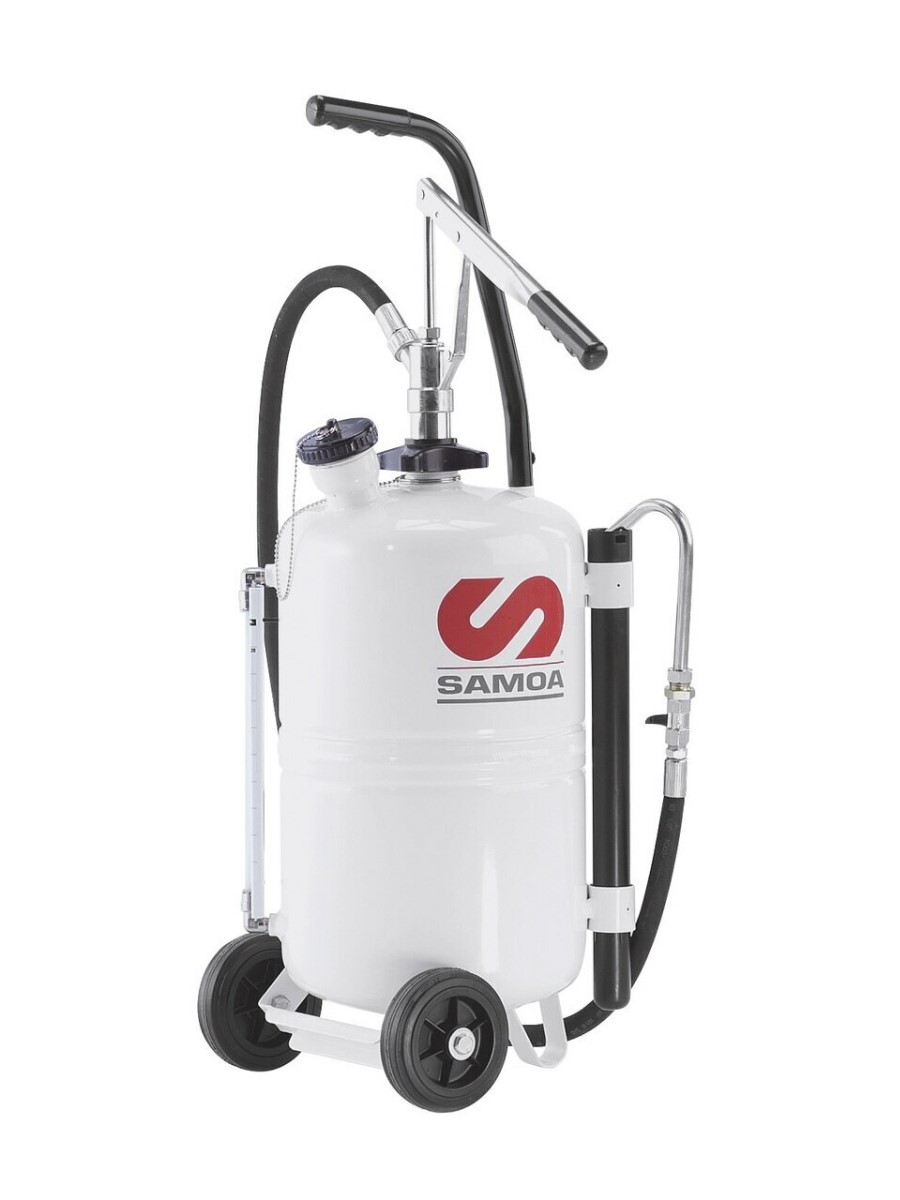 Ручной маслораздатчик на 25 литров. Автономная установка со стальной емкостью 25 л (6,6 галлона США) и датчиком уровня. Установка включает в себя насос с рычажным принципом действия и подающий шланг длиной 1,5 м с клапаном и насадкой 135º.