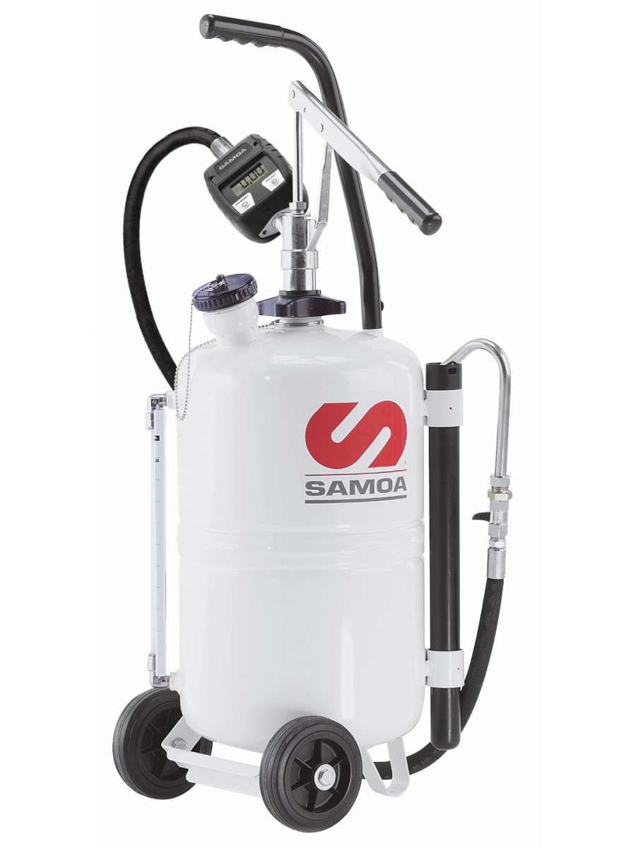 Ручной маслораздатчик с расходомером, 25 литров Автономная установка со стальной емкостью 25 л (6,6 галлона США) и датчиком уровня. Установка включает в себя насос с рычажным принципом действия, цифровой расходомер на выходе насоса и подающий шланг длиной 1,5 м с клапаном и насадкой 135º.
