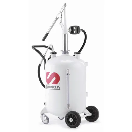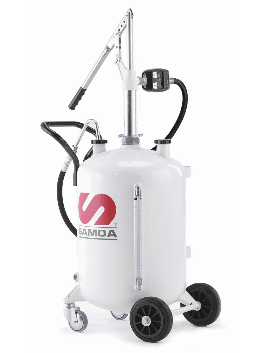 Автономная установка с емкостью 70 л (17 галлонов США) с датчиком уровня. Установка включает насос с рычажным принципом действия, счетчик масла с цифровым дисплеем на выходе насоса и подающий шланг 1,5 м с клапаном и насадкой, изогнутой под углом 135º.