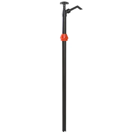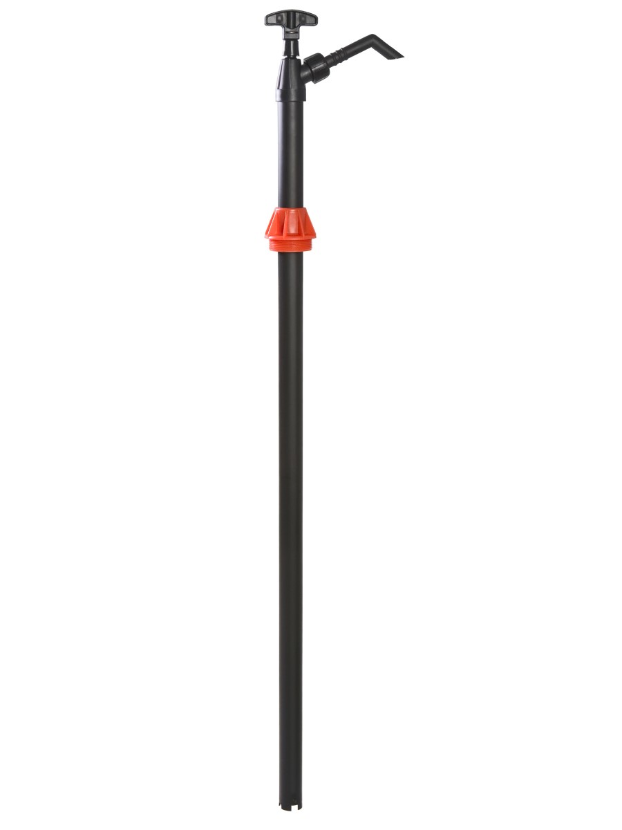 Подъемный насос с поршнем с нейлоновым покрытием и уплотнениями из ПТФЭ для бочек 205 л. Всасывающая труба 1000 мм, переходник 2" и выпускной штуцер. Насос черного цвета с красным переходником и гайкой штуцера. Рекомендуется для кислотных жидкостей. моющих средств и растворителей на основе керосина.