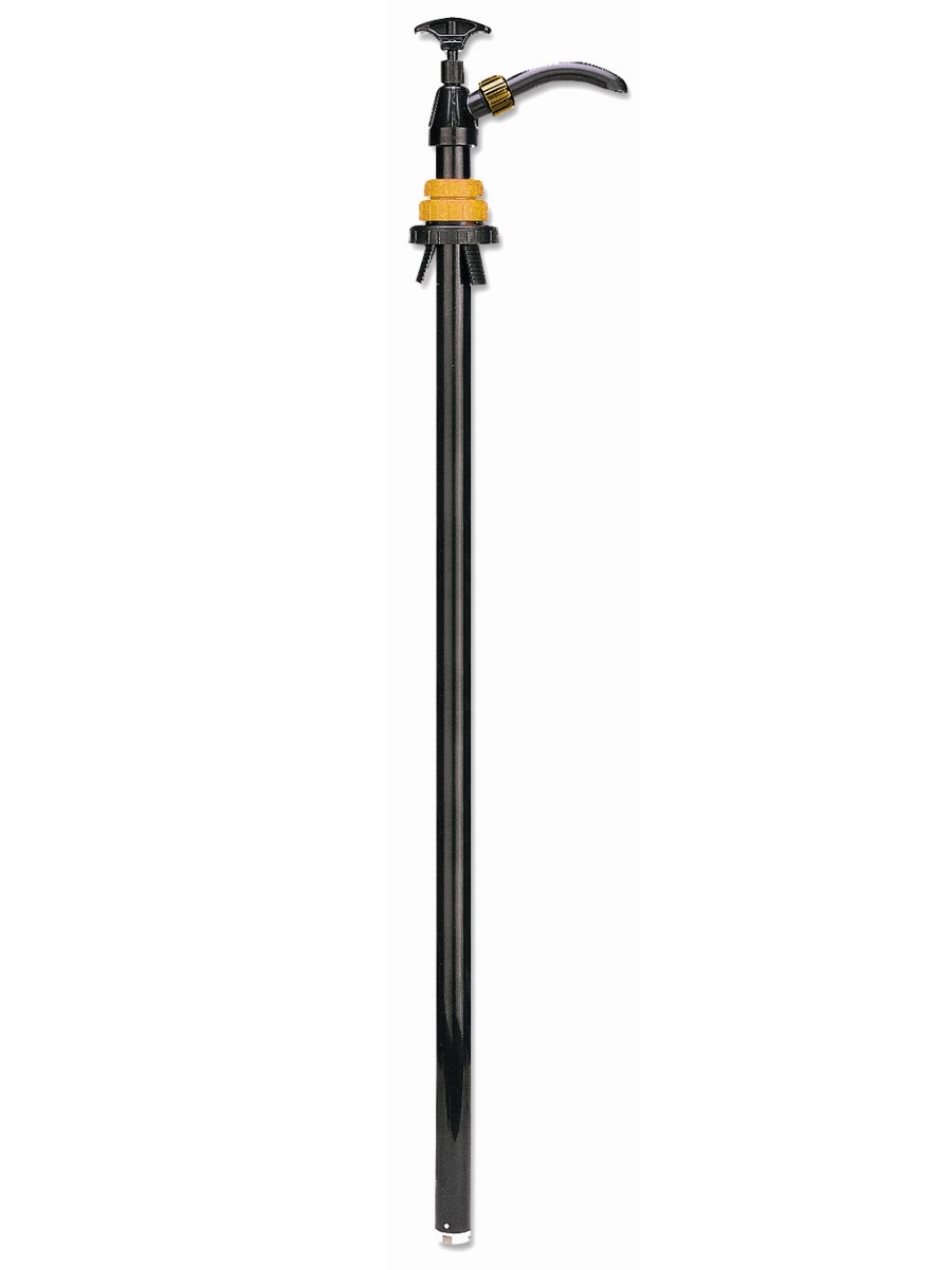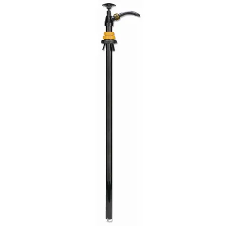 Подъемный насос с поршнем с нейлоновым покрытием и уплотнениями из ПТФЭ. Всасывающая труба 1000 мм, переходник диам. - 60 мм с тремя винтами и выпускной штуцер. Насос черного цвета с желтым переходником и гайкой штуцера.
