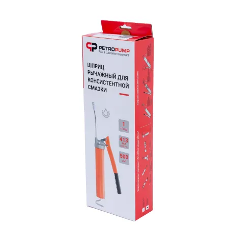 Алюминиевая головка имеет клапан для загрузки смазки и стравливания воздуха. Удобная в использовании мягкая резиновая рукоятка. Высокопрочное покрытие. Производительность составляет 1 г/ход. Объем шприца 500 см3. Соединение 1/8" BSPT. Поставляется с 300 мм гибким шлангом и 4-х лепестковой насадкой.