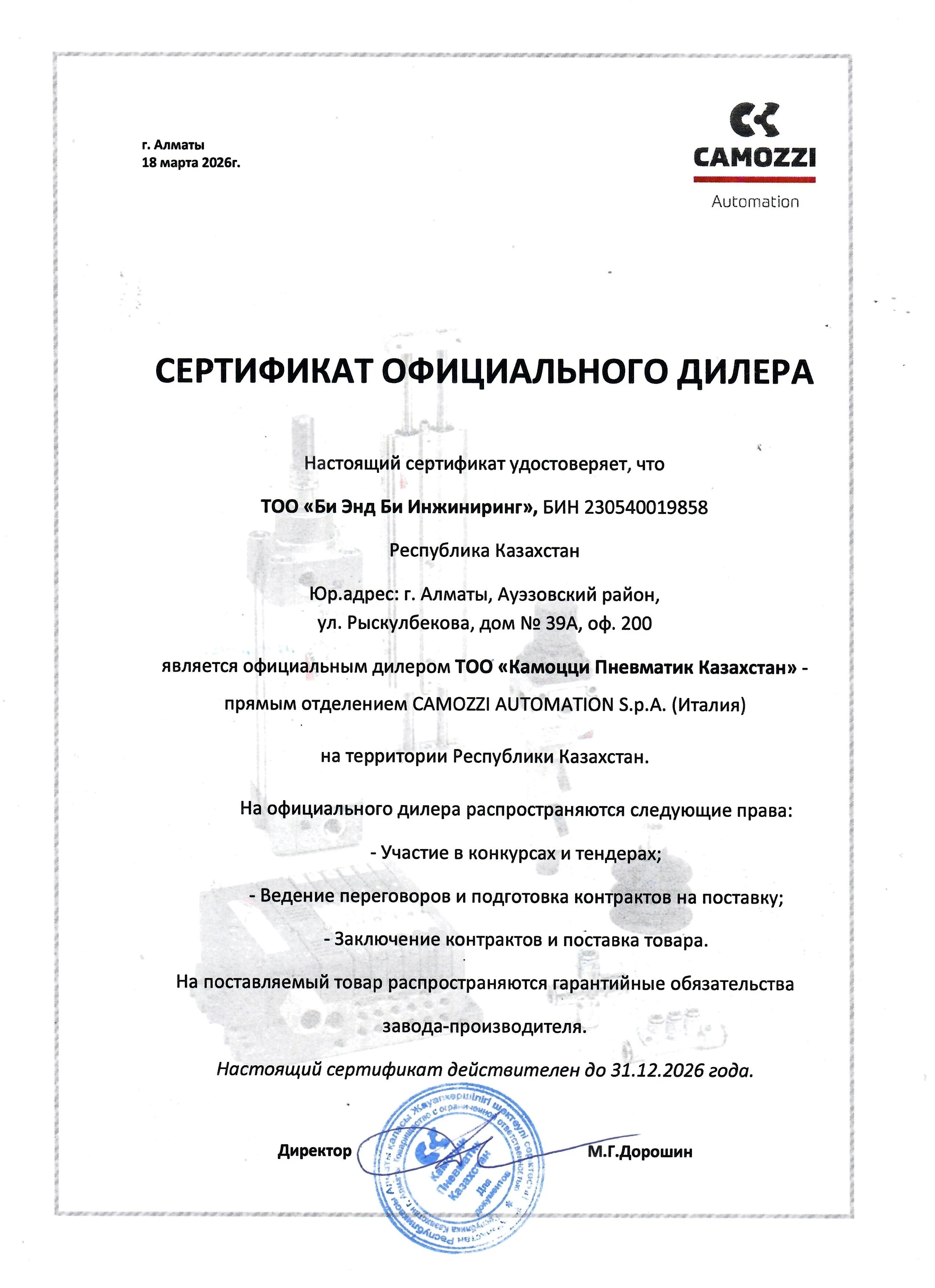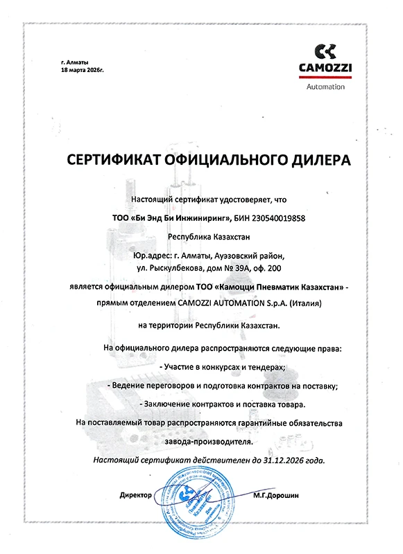 Компания «Би Энд Би Инжиниринг» является официальным дилером бренда Camozzi, что подтверждается дилерским сертификатом. |