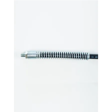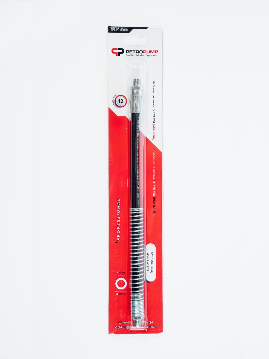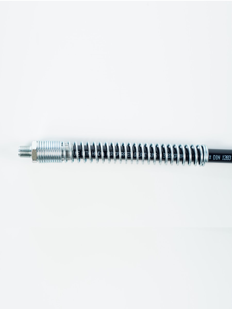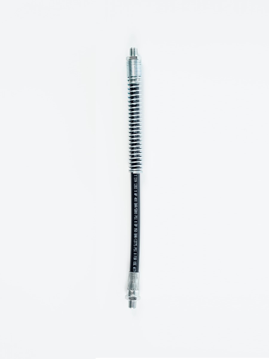Шланг усиленный для смазки с защитной пружиной 300 мм х 1/8" BSPT. Давление на разрыв: 950 бар. Рабочее давление 400 бар.