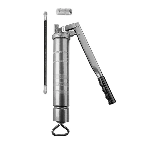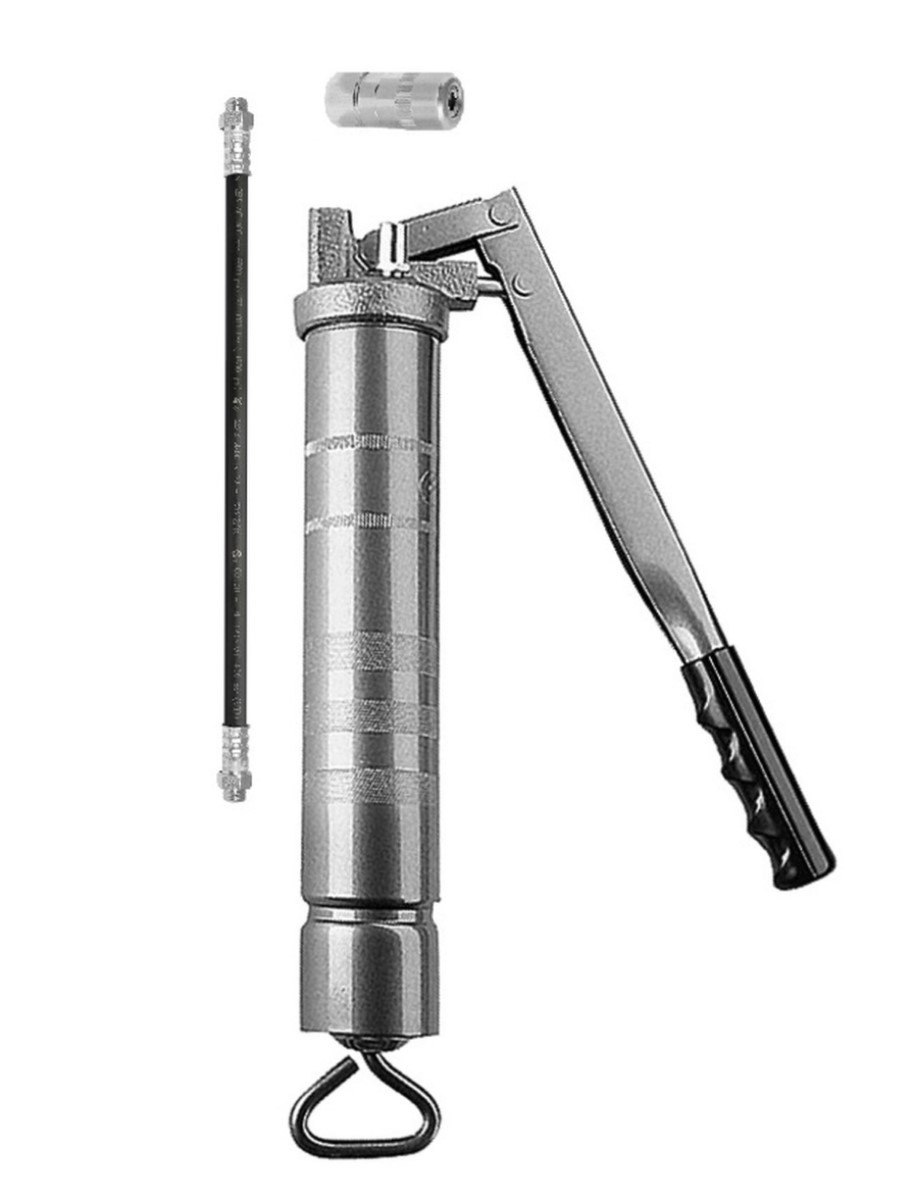 Ручной рычажный насос объемом 500 см3 для консистентной смазки для консистентной смазки с заливочным клапаном 128 003 и резиновым шлангом с металлической оплеткой длиной 300 мм с четырехлепестковым гидравлическим соединителем (№ 137 031).