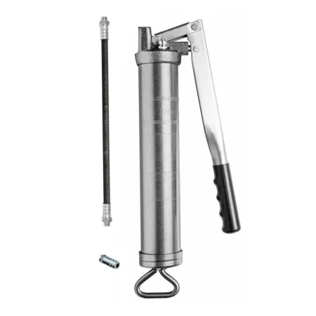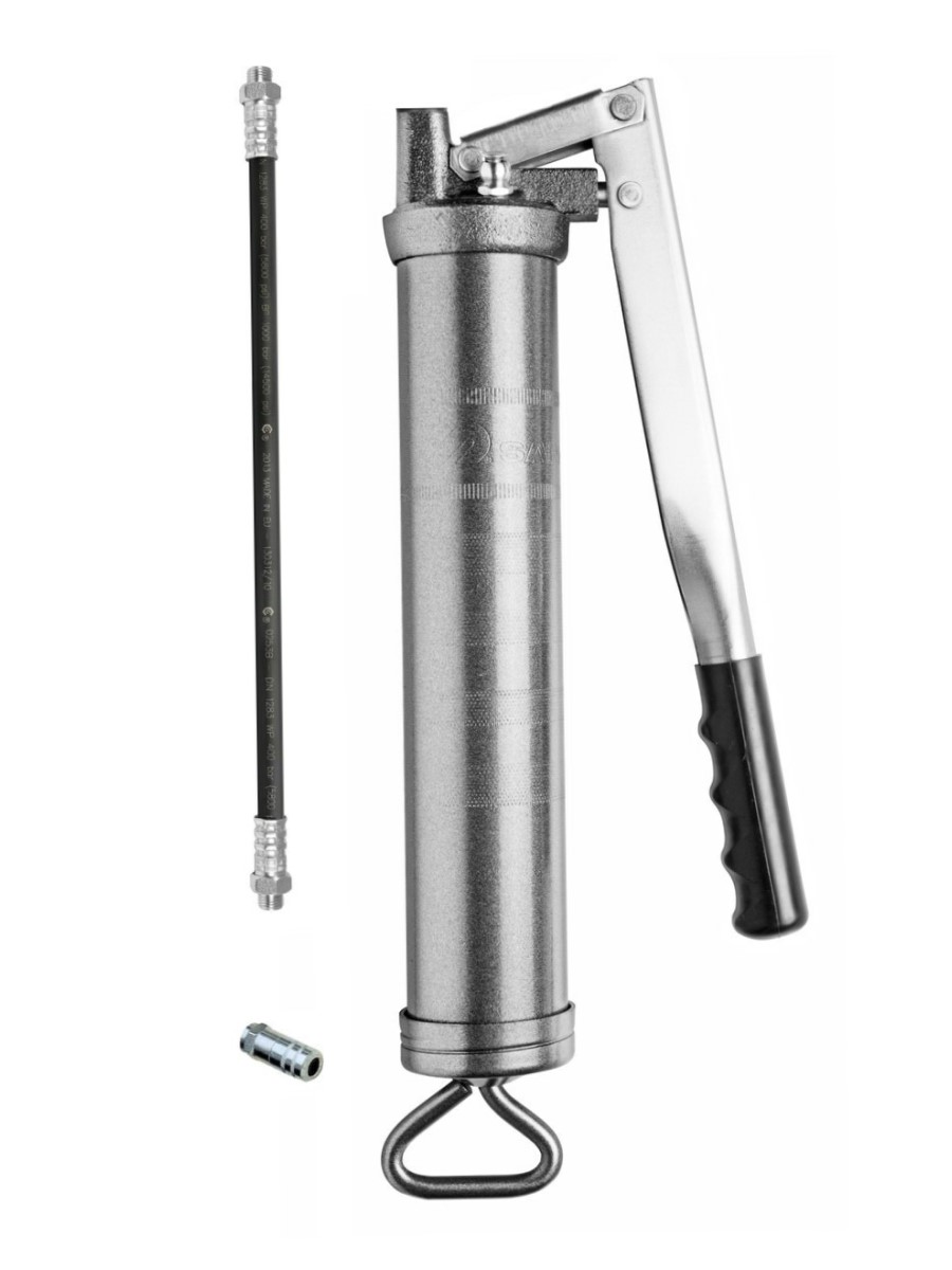Рычажный насос для консистентной смазки объемом 500 см 3 с переменным ходом. Высокопрочный рычажный насос для консистентной смазки из емкостей или смазочных патронов 400 г (14 унций). Насос с переменным ходом: высокое давление при коротком ходе, большой объем – при полном ходе. Сверхпрочная чугунная крышка с закаленным поршнем, воздуховыпускной клапан, заливочный ниппель, запорный клапан и крышка поршневого блока (снимаются для чистки) и вращающийся на 360º с резиновым шлангом с одной металлической оплеткой длиной 300 мм с четырехлепестковым гидравлическим соединителем (номер детали 137 031).