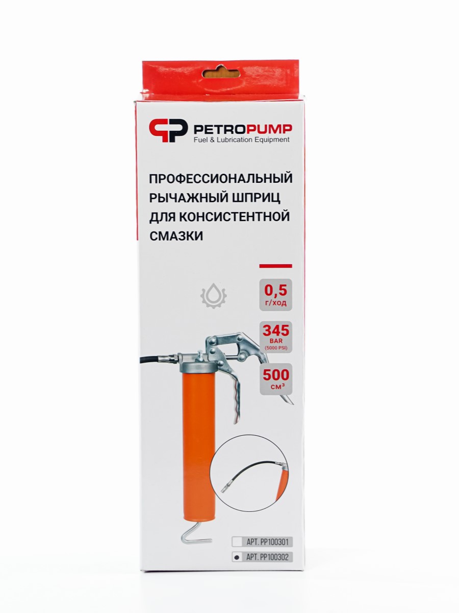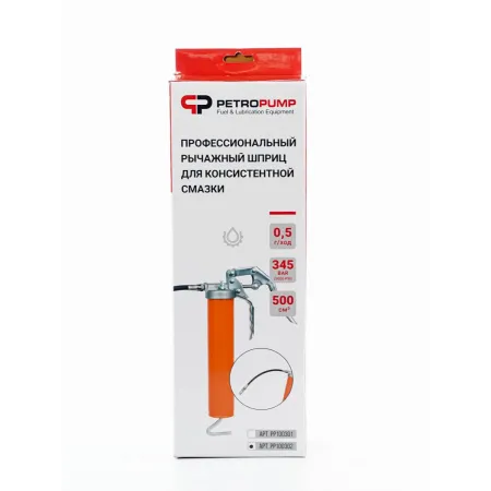 Шприц пистолетного типа для раздачи консистетной смазки объемом 500 см3. Предназначен для дозированной подачи смазки в рабочие узлы оборудования. Производительность шприца 0,5 г/ход. Резьба 1/8" BSPT. Рабочее давление 345 бар. Укомплектован гибким шлангом 300 мм с 4-х лепестковым наконечником