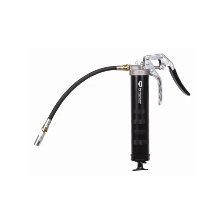 Шприц пистолетного типа для консистеной смазки объемом 500 см3. Предназначен для дозированной подачи смазки в рабочие узлы оборудования. Производительность составляет 0,5 г/ход. Резьба 1/8" BSPT. Рабочее давление 345 бар. Укомплектован клапаном стравливания воздуха, гибким шлангом 300 мм с 4-х лепестковым профессиональным наконечником