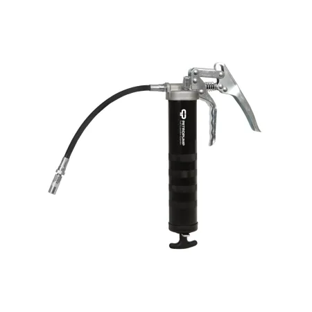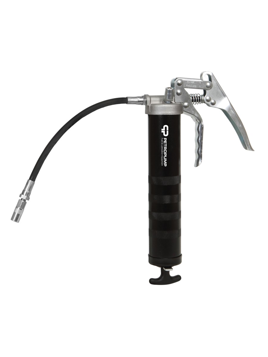 Шприц пистолетного типа для консистентной смазки объемом 500 см3. Предназначен для дозированной подачи смазки в рабочие узлы оборудования. Производительность составляет 0,84 г/ход. Резьба 1/8" BSPT. Рабочее давление 483 бар. Укомплектован клапаном стравливания воздуха, гибким шлангом 300 мм с 4-х лепестковым профессиональным наконечником