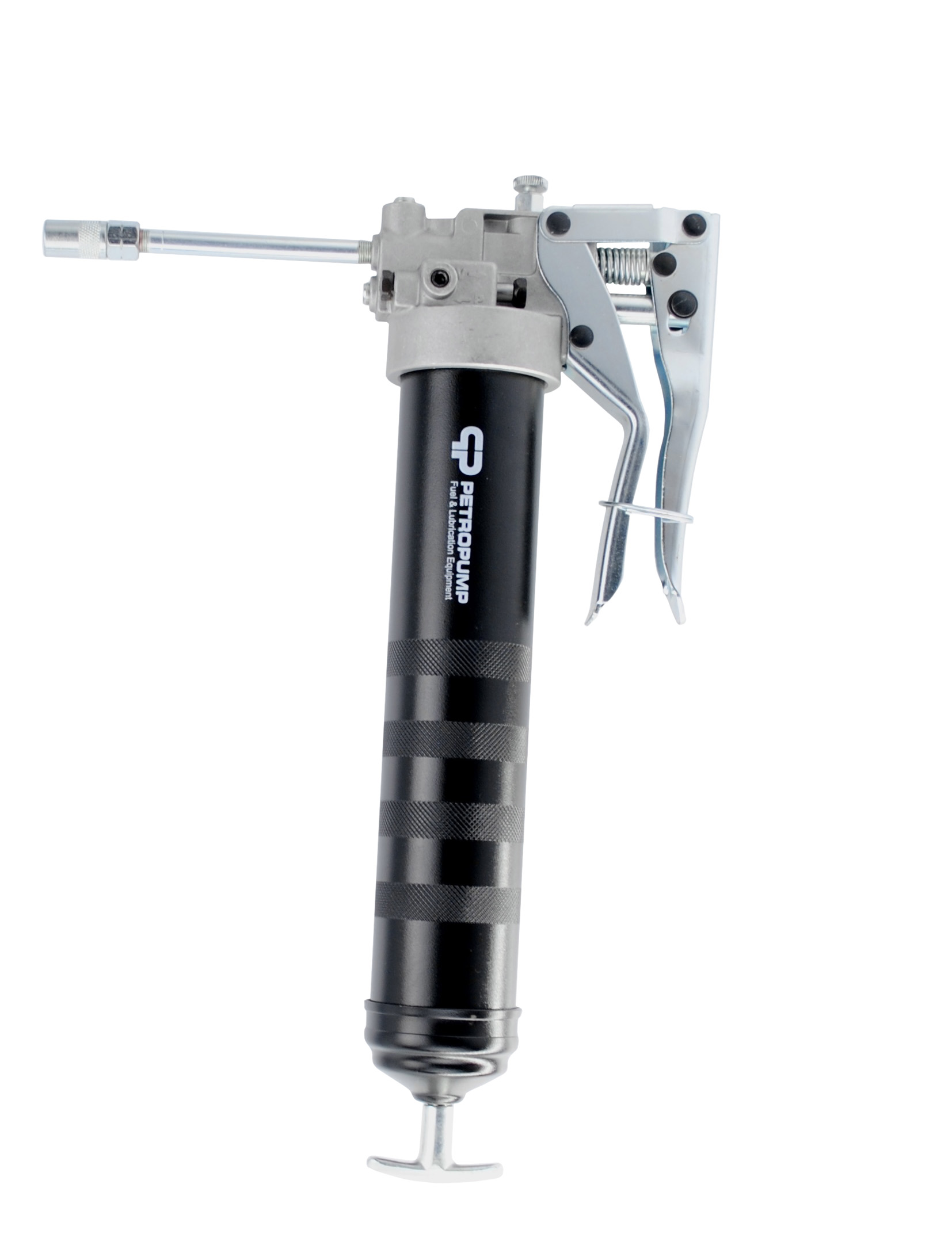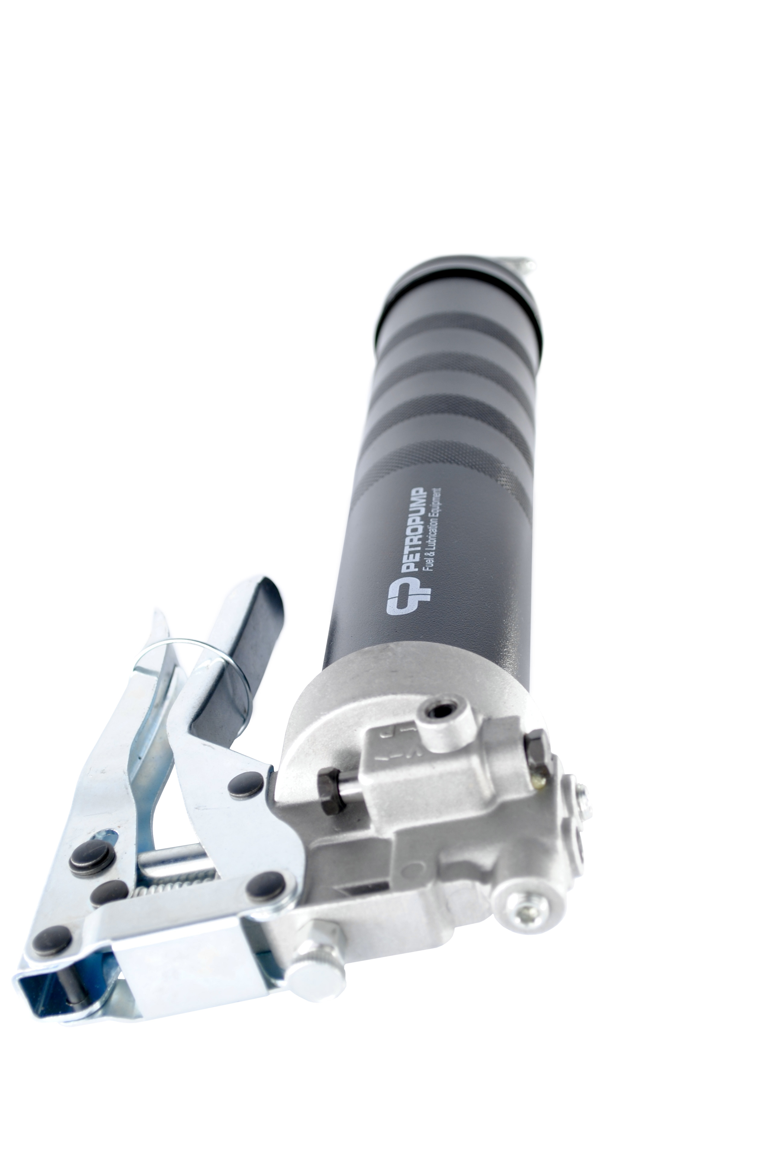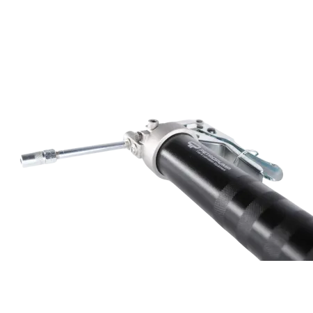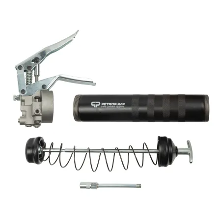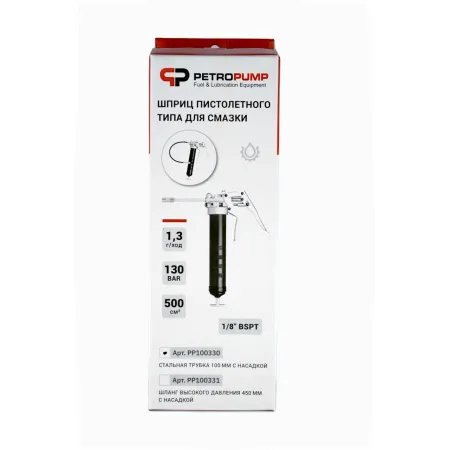 Шприц для смазки пистолетного типа объемом 500 см3. Оснащен стальной трубкой 100 мм и насадкой. Рабочее давление 130 бар. Производительность 1,3 г/ход. Соединение 1/8" BSPT. Заправка осуществляется с помощью заливочного насоса либо картриджа объемом 400 г. Оснащен сверхмощной пружиной и алюминиевой головкой для заправки и стравливания воздуха.
