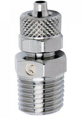 Форма фитинга: штуцер прямой с нар. резьбой • Подключение: R1/4-6/4 мм • Материал корпуса: латунь никелированная