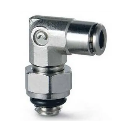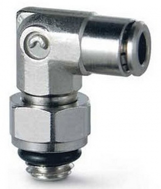 Форма фитинга: штуцер угловой с нар. резьбой поворотный • Подключение: M5-3 мм • Материал корпуса: латунь никелированная