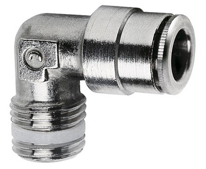 Форма фитинга: штуцер угловой с нар. резьбой • Подключение: R1/8-6 мм • Материал корпуса: латунь никелированная