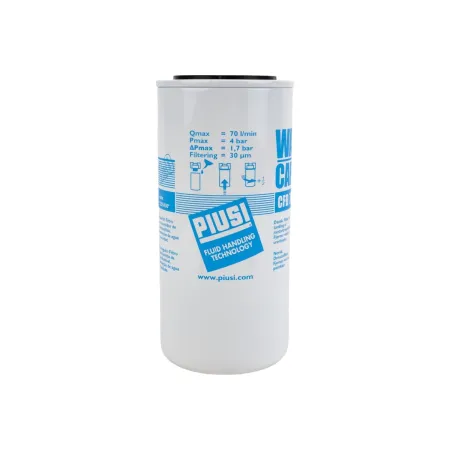 Патронные напорные водопоглощающие фильтры. Фильтр-сепаратор воды. Напорный фильтр патронного типа с поглощением воды. Данный фильтр дает гарантию защиты двигателей, получающих дизельное топливо на АЗС. Характеристикой этого типа фильтров является сепарация и поглощение воды, находящейся в нагнетаемом дизельном топливе. Поглощение воды вызывает уменьшение фильтрующей способности с постепенной потерей нагрузки. Отработанный водой фильтр подлежит замене. Эксплуатационные данные: Фильтрующая способность 30 мкм, Пропускная способность 70 - 150 л/ Мин. Рабочее давление 3.5 бар. Давление разрыва 10 бар.