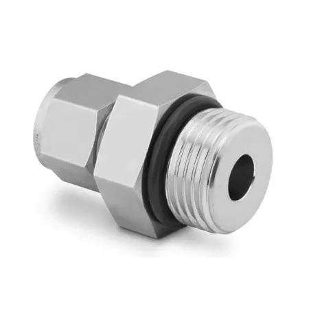 Обжимной прямой штуцер с наружной резьбой UNF 3/4″-16 — переходное соединение для подсоединения трубки Ø10 мм к резьбовым портам в технологических контурах. Конструкция решает задачу герметичного присоединения измерительных линий, газовых и жидкостных трасс низкого и среднего давления в системах КИПиА, гидравлике и лабораторных установках. Уплотнение трубки обеспечивается двух-обжимной системой (две обжимные втулки + гайка), а уплотнение резьбы — выступающим O‑ring, который компенсирует вращение и обеспечивает статическую герметизацию между резьбовыми поверхностями.