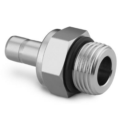Переходник прямой с наружной резьбой втулочный, форма фитинга: переходник прямой с нар. резьбой втулочный; применяется для соединения трубных линий инструментального и технологического оборудования, где требуется переход с резьбы UNF 7/16"-20 на втулочную посадку 1/4". Работает по принципу двухобжимного соединения: камера с двумя обжимными кольцами и гайкой обеспечивает механическую фиксацию трубки Ø 1/4" (6,35 мм) и первичное герметичное уплотнение, выступающее O‑ring в резьбе обеспечивает дополнительную герметизацию на стыке резьбового соединения.