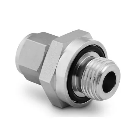 Прямой штуцер с нарезной трубной резьбой NPT1/4 — переходной обжимной фитинг для подсоединения 1/4" трубки к резьбовому патрубку NPT1/4. Предназначен для подачи рабочих газов и жидкостей в технологические линии КИПиА, лабораторные системы и промышленные установки, где требуется герметичное соединение с возможностью демонтажа. Принцип работы — двухобжимная конструкция: при затяжке гайки два обжимных кольца (ferrules) деформируются и фиксируют трубку, а утопленное O‑ring в резьбе обеспечивает дополнительную уплотняющую прокладку между металлической резьбой и корпусом, снижая риск протечек при вибрациях и перепадах давления.
