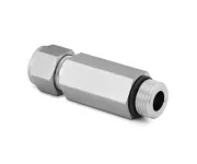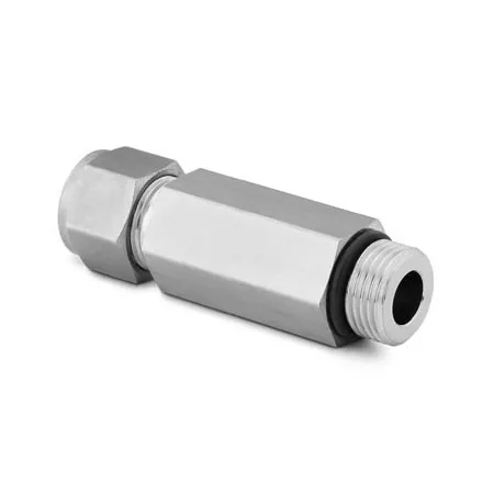 Прямой обжимной штуцер с наружной резьбой UNF 7/16"-20 — переходное соединение для подключения 1/4" трубки к резьбовым портам приборов и магистралей. Конструкция решает задачу герметичного присоединения в приборостроении, системах КИПиА, вакуумных установках и гидравлике низкой и средней мощности. Рабочий принцип: трубка фиксируется металлометаллическим обжатием двумя обжимными кольцами (феррулами) и гайкой, а торец наружной резьбы уплотняется выступающим O-ring, исключающим протечки по резьбе при давлении до типичных 6000 psi (≈413 бар) для размеров 1/4" при нормальной температуре.