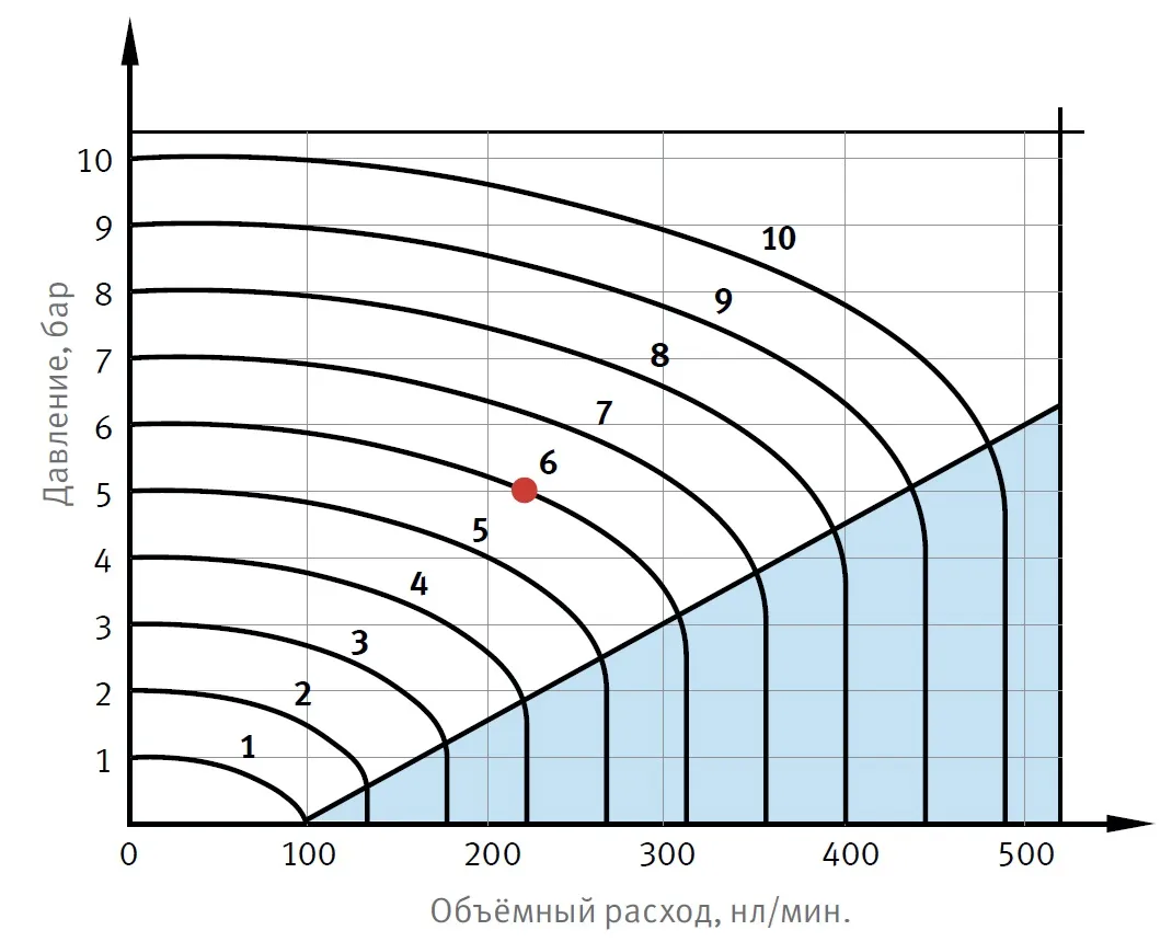 В реальной жизни условия работы устройства могут отличаться от стандартных, поэтому и расход оно будет пропускать другой. При наличии расходно-перепадной характеристики это сделать просто – находим на нужной кривой p1 (давление на входе, например, давление питания) точку, соответствующую давлению на выходе р2, и считываем показания расхода.