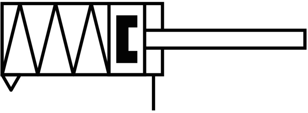 Цилиндры одностороннего действия имеют только одно отверстие пневматического подключения. Движение под действием сжатого воздуха осуществляется в одну сторону, возврат осуществляется при помощи пружины. Таким образом, для управления таким цилиндром требуется всего один пневматический сигнал.