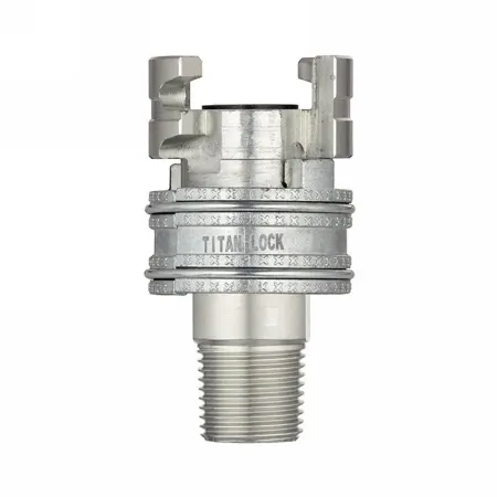 БРС серия P (Thor) TLPSM8 TITAN LOCK - это пневматическое соединение для передачи жидкостей, воздуха, воздуха с масляными вкраплениями и их производными. Соединение типа "розетка" ("мама") с наружной резьбой NPT. Полная комплектация соединения представлена в качестве БРС серии P "папа" и БРС серии P "мама". Фиксация элементов происходит за счет шарикового затвора.