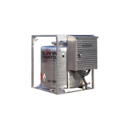 Изготовлен из стали (AISI 304) и герметично сварен, оснащён внешней защитной противоударной и фиксирующей конструкцией, двумя внутренними стенками - волнорезами (из нерж. стали INOX), «карманами» для ввода вил погрузчика и проушинами для подъёма сверху даже полного объёма.
